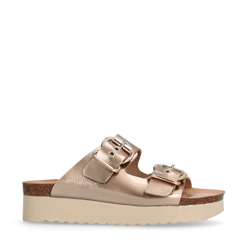 Greta, slip-in sandaler från Sweeks i metallikskimrande skinn med två reglerbara remmar och kopparfärgade spännen. Ljus innersula i skinn och en beige, lite lägre, lätt platåsula i gummi. Sweeks är märket som andas sommar. Produkterna är utvecklade för att passa både vardag och fest. Mjuka insocks och fina materialval.