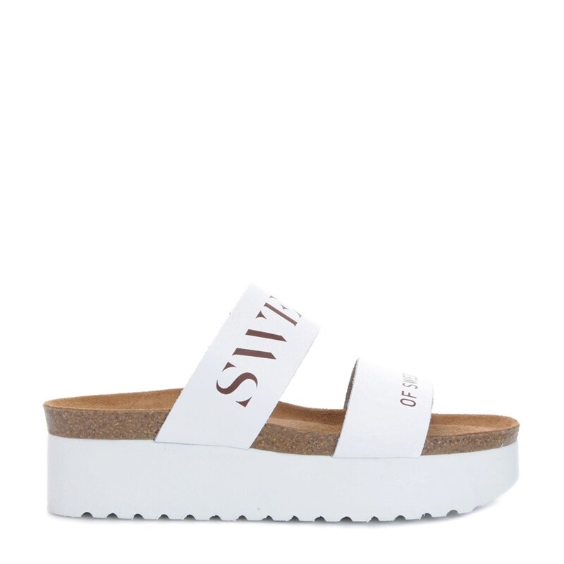 Hedda, sandaler från Sweeks. Slip-in sandaler med två band i vitt skinn och logotext över foten. Ovandelen tillsammans med den sportiga kork- och platåsulan i vitt gummi skapar ett trendigt uttryck. Innersula i skinn. Modellen finns i flera härliga färger. Sweeks är märket som andas sommar, modellerna är designade för att passa både till vardag och fest. De har en avslappnad look som passar till kjol, shorts och byxor. Liten i storlek.