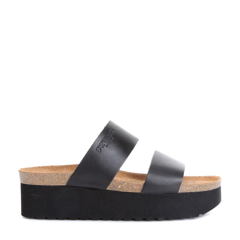 Hedda, sandaler från Sweeks. Slip-in sandaler med två band i svart skinn över foten. Ovandelen tillsammans med den sportiga platåsulan i kork och svart EVA skapar ett trendigt uttryck. Innersula i skinn. Modellen finns i flera härliga färger. Sweeks är märket som andas sommar, modellerna är designade för att passa både till vardag och fest. De har en avslappnad look som passar till kjol, shorts och byxor. Liten i storlek.