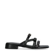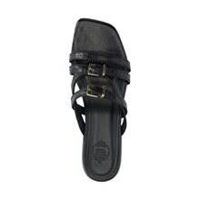 La Trevico, sandaler från Novita med smala remmar i svart, crockopräglat skinn. Med de två guldfärgade spännena över foten kan du justera passformen, foder och innersula i svart, mjukt skinn, låg klack ca 2 cm hög.