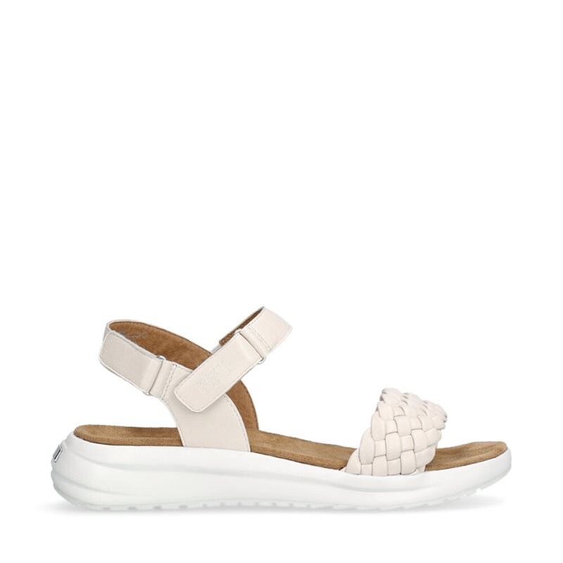 Pomelo, sandaler från Dasia. Bred flätad rem över tårna i offwhite skinn och två remmar runt vristen som du kan justerar med velcroband till perfekt passform. Innersula med gelkuddar för fin komfort och stötdämpning. Extra bred läst, yttersula i lättviktsmaterial med gummerad struktur på undersidan för bra grepp.