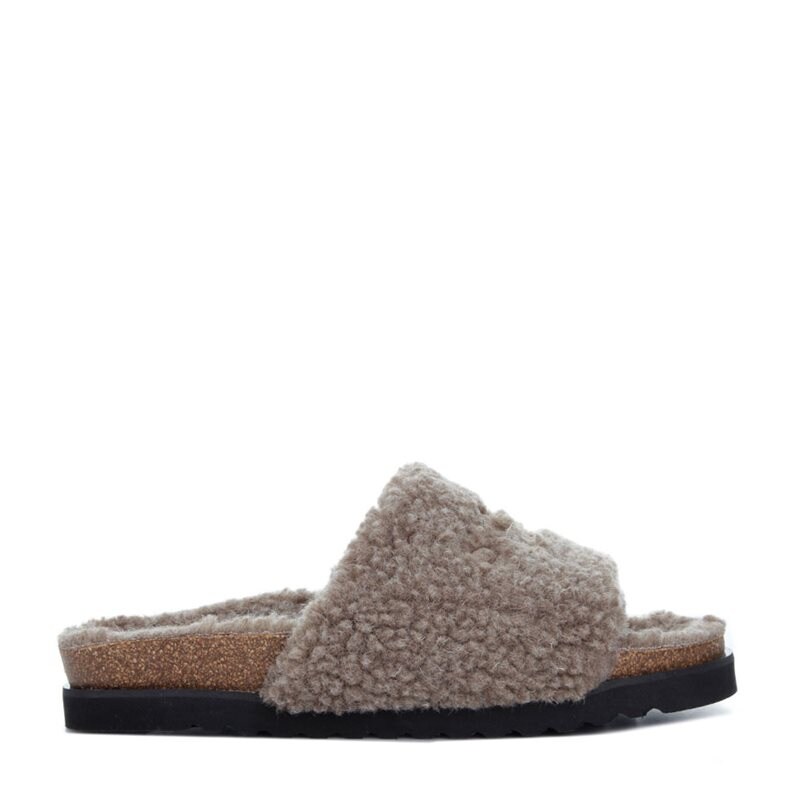 Saga, slip-in tofflor från Sweeks med ovandel samt innersula i mjuk äkta ull på textil i en snygg gråbeige nyans. Ovandelen har en broderad logo som är ton-i-ton med ullen. Fotbädd i kork, klädd med ull på textil, samt lättviktssula för mjuk komfort.