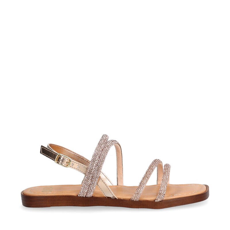 Siris, sandaler från Dasia med två smala, guldbeiga remmar framtill över foten samt en smal rem runt hälen som knäpps med guldfärgat spänne. Ovandel med roséfärgade stenar och sula med tvär tå. En mjuk och uppbyggd innersula helt i skinn gör sandalerna riktigt bekväma och blir de perfekta skorna till och fest och vardag.