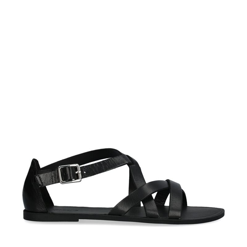 Tia 2.0, sandaler från Vagabond Shoemakers med korslagda remmar i svart skinn. Stängd häl, justerbar ankelrem och en låg klack ca 1 cm hög.
