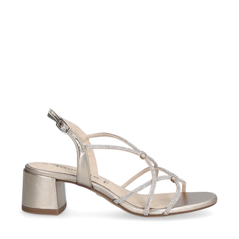Sandaletter från Tamaris, smala remmar med små gnistrande stenar korsade över foten. Ovandel i guldfärgat syntetmaterial och blockklack ca 5 cm hög.