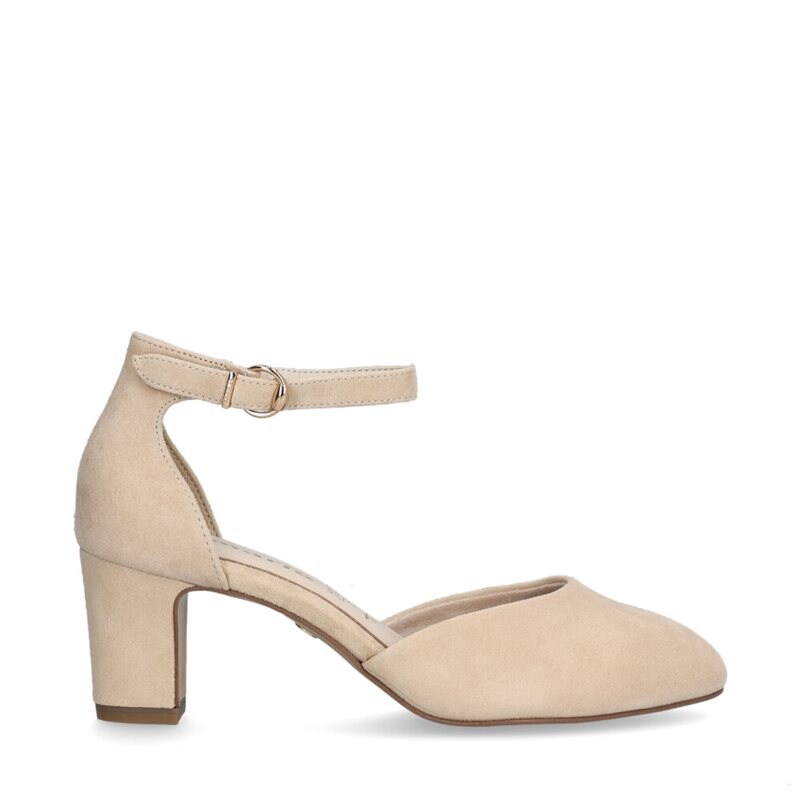Sandaletter från Gabor i beige mocka med en bred blockklack. Rundad tå och rem runt ankeln som knäpps med guldfärgat spänne.
