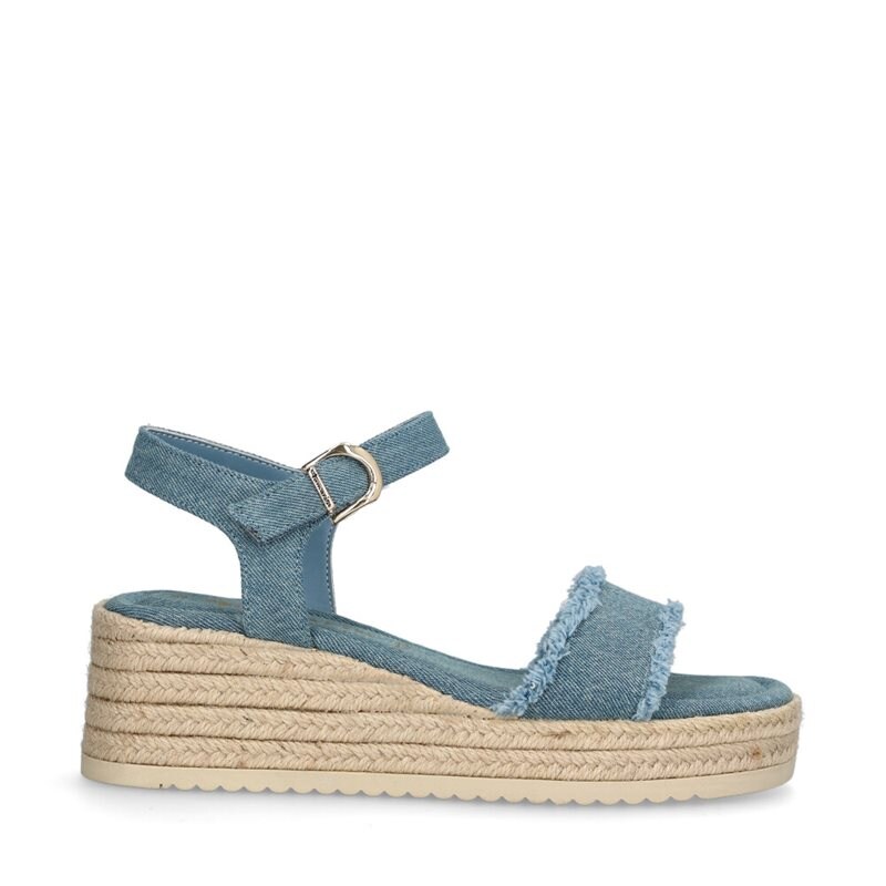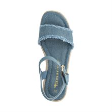 Sandaletter från Tamaris i jeansfärgat tyg gör dessa skor till en av sommarens favoriter! Kliklack klädd med ljusa flätade band på sidan. Rem runt ankeln som justeras med guldfärgat spänne.
