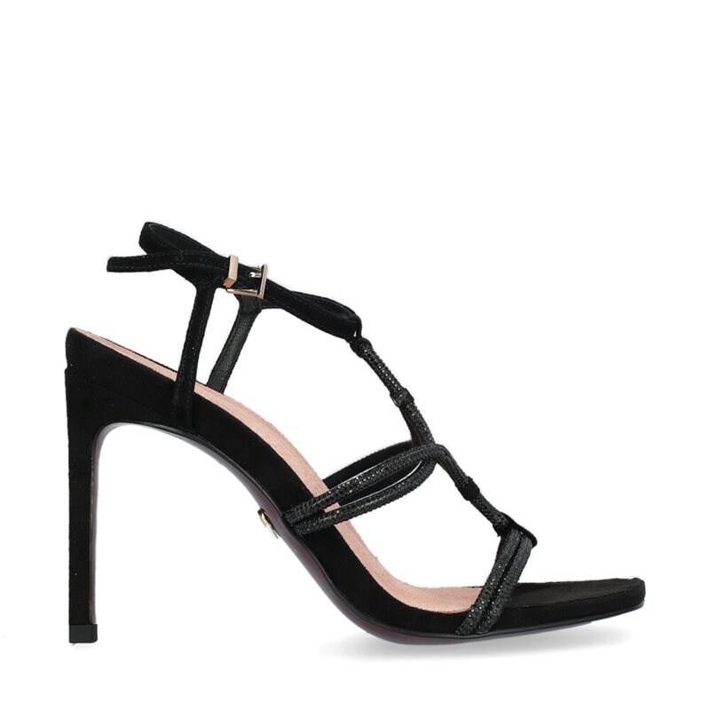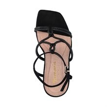Sandaletter från Tamaris med hög klack, ca 10 cm. Svarta, smala glittriga remmar över foten, vristrem som justerars med spänne.