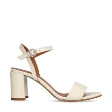 Casalina sandaletter från Novita i offwhite skinn. Deras stilrena design, med smalt läderband över foten och vackra kristalldekorationer på spännet vid vristen, är perfekta för att komplettera din outfit. Med en skinnklädd blockklack på cirka 7 cm höjd ger dessa sandaletter en sofistikerad touch till varje klädval.