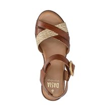 Flora från Dasia - remsandaler med jute-inspirerad kilklack. Ovandel i cognacsfärgat skinn med en bredare rem i beige i dekorativt flätmönster. Rem runt hälen med spänne för bättre passform. Mjuk innersula i skinn för ett fotklimat och komfort. Kilformad kilklack i jute look som mäter 5 cm, kombineras med en slitsula i gummi som säkerställer bra grepp.