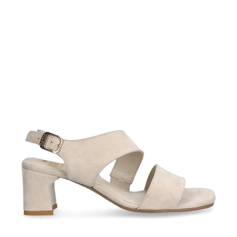 Ginger, sandaletter från Dasia i mjuk, ljusbeige mocka. Bred rem framtill samt assymetrisk rem från insidan över vristen, rem med dekorativt guldfärgat spänne. Skorna har en rak tåform och klackhöjd på ca 5 cm. Komfortinnersula med foam, klädd med skinn, flexibel yttersula i gummi för bra grepp.