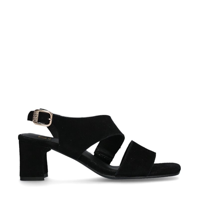 Ginger, sandaletter från Dasia i mjuk, svart mocka. Bred rem framtill samt assymetrisk rem från insidan över vristen, rem med dekorativt guldfärgat spänne. Skorna har en rak tåform och klackhöjd på ca 5 cm. Komfortinnersula med foam, klädd med skinn, flexibel yttersula i gummi för bra grepp.