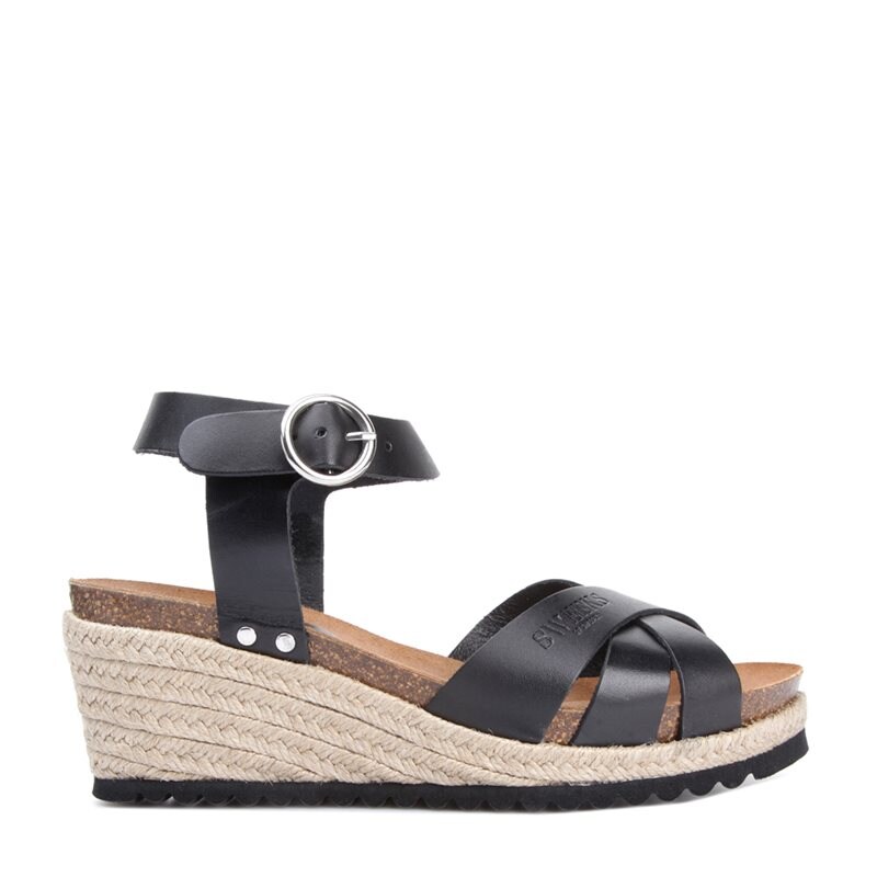 Selma, sandaletter från Sweeks. Ovandel i svart skinn med tre korsade remmar över foten samt vristrem som regleras med ett runt, metallspänne. Skorna har en skön innersula i kork, klädd med mocka. Kilklacken med flätad jute, som skapar ett trendigt och fräscht uttryck, svart räfflad gummisula. Liten i storlek.
