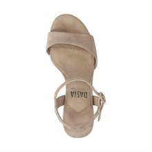 Sandalett Syringa beige, från Dasia. Beige mocka. Asymmetrisk rem över tån. Reglerbar rem runt ankel med spänne i silver. Foder och innersula i skinn. Söt mandelformad tå. Klackhöjd på ca 6 cm. Komfortinnersula med foam, klädd med skinn, flexibel yttersula i gummi för bra grepp.