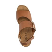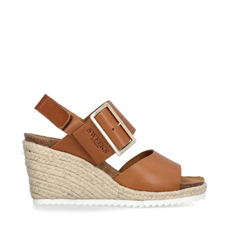 Tyra, sandaletter från Sweeks i cognacsfärgat skinn med breda remmar över foten och en smal rem runt hälen som knäpps med kardborreband. Kilformad sula klädd med jute och slitsula i vit EVA.