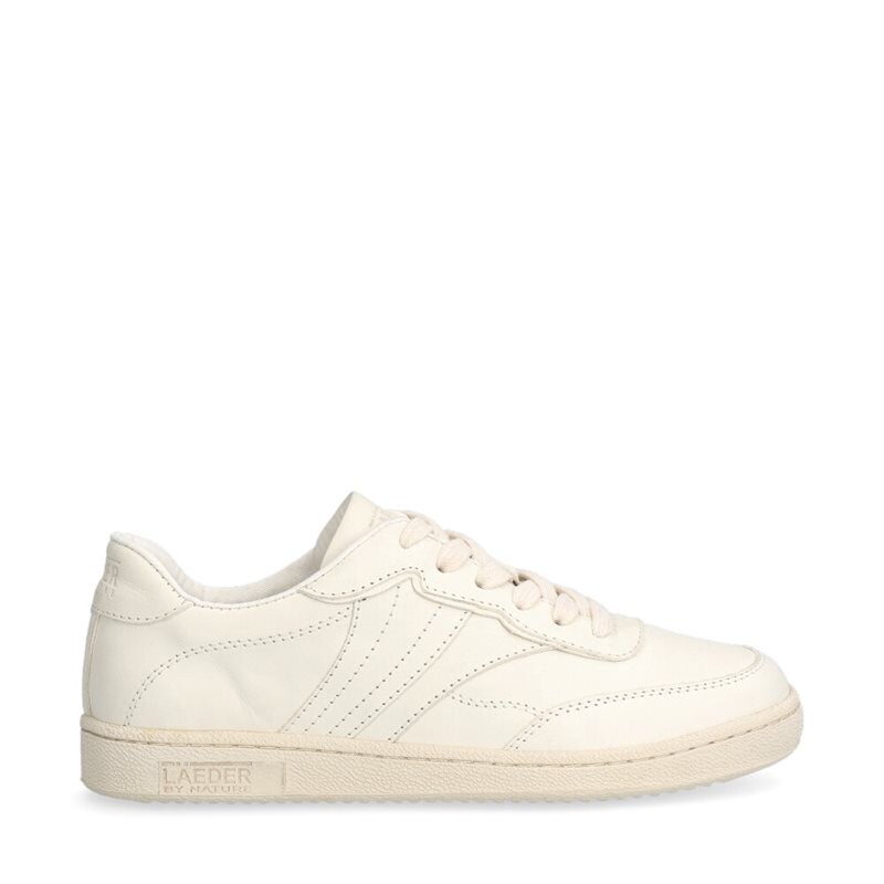 Agar, sneakers från Läeder by Nature i offvitt,kromfritt skinn. Foder och skoband tillverkade av bomull i Organic Textile Standard, innersulor i skummaterial som består av 100% återvunnen PU. Sneakerssula i gummiblandning, 30% naturgummi och 70% syntetisk gummi, med en beige ton som bryter av snyggt mot det vita skinnet i ovandelen. Hela skon är tillverkad i en miljömedveten process, inkl emballage och energiproduktion.