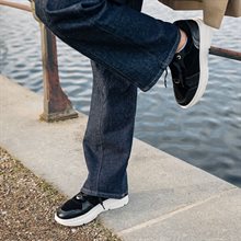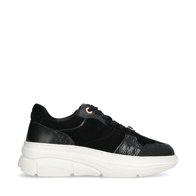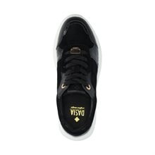 Dahlia, sneakers från Dasia med ovandel i svart skinn och mocka. Fodrade med textil och skinn. Snyggt designad yttersula i vitt gummi, ca 4 cm hög.