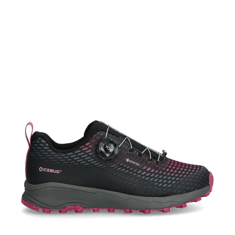 Haze, sneakers från Icebug. Ovandel i svart med rosa detaljer och Gore-Tex®-membran som håller fötterna torra. BOA®-system gör det enkelt att justera snörning till perfekt passform med ett vridreglage. Sneakers som passar lika bra för en löptur i skogen som till långa stadspromenader.