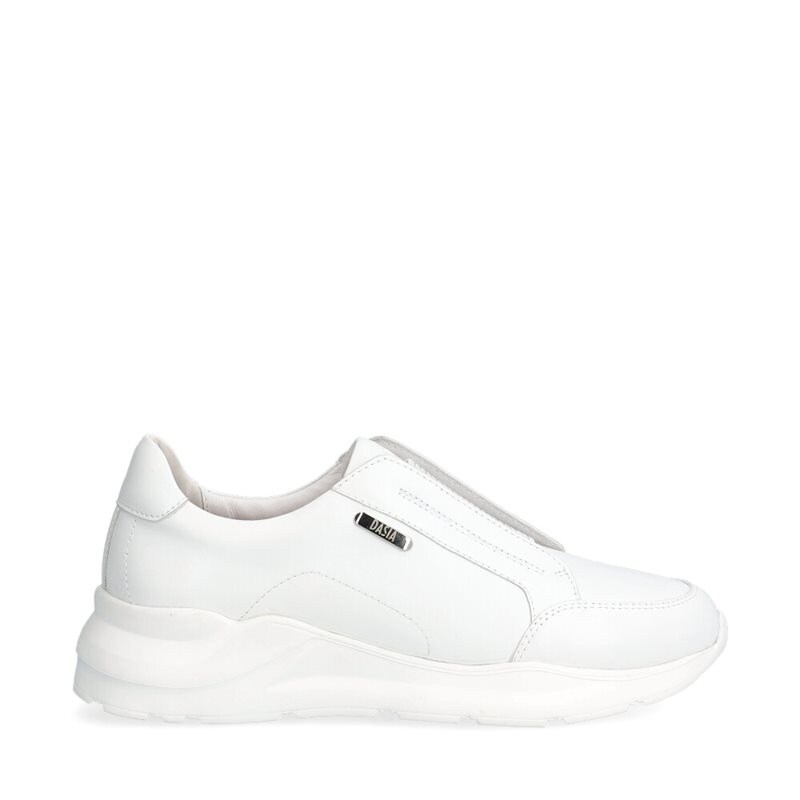 June, sportiga sneakers med en ovandel i vitt skinn. Bred elastik på ovandelen gör det enkelt att ta på och av skorna. Dessa sneakers är helt skinnfodrade och har en uttagbara innersulor i skinn. Yttersula i lättviktsmaterial av en gummiblandning.