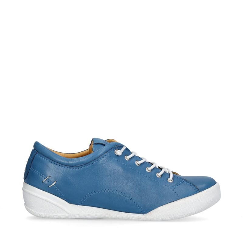 Lantana, sneaker från Dasia med ovandel i mjukt följsamt blått skinn. Mjukt skinnfoder på insidan, samt en flexibel mjuk yttersula i gummiblandning med en liten inbyggd kil. Skon har en supermjuk komfortinnersula och elastiska snören som gör den lätt att ta på och av.