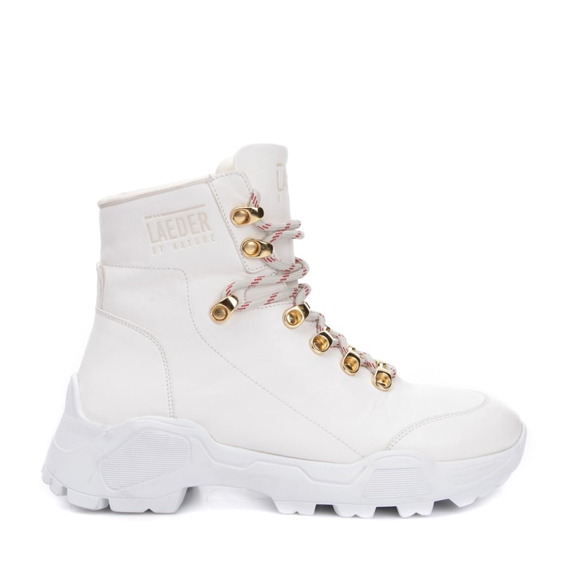 Röllika, sportinfluerade sneakerkängor från Läeder by Nature. Ovandel i vitt, lyxigt vegetabiliskt garvat skinn. Foder i mjukt kromfritt garvat getskinn för bästa komfort. Skorna snöras med vita skoband med röda detaljer och guldfärgade öljetter. Yttersula i högkvalitativ vit gummiblandning med god flexibilitet. Röllika är ett gediget hantverk, tillverkade i Portugal av material med högsta kvalitet.