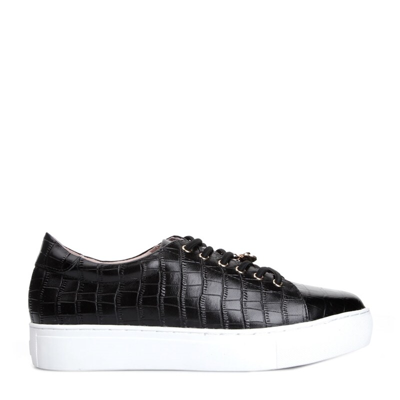 Starlily, sneakers från Dasia med ovandel i crocopräglat svart skinn. Elastiska snören med avtagbart dekorativt hänge. Uttagbar innersula som är skinnklädd och har ett mjukt stötdämpande material i form av en kil på ca 1 cm, vilket ger dig högsta tänkbara komfort. Foder i skinn samt platåyttersula i vitt gummi. Dasia är designade skor med feminina influenser, stilrena linjer och hög komfort.