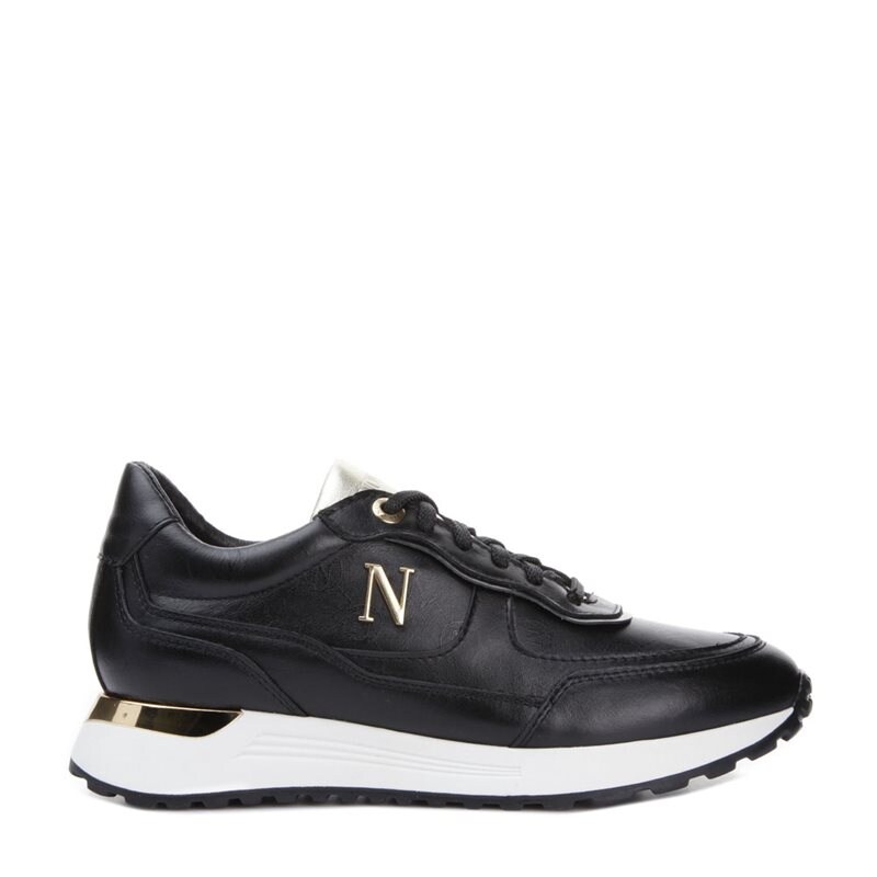 Vizzini, sneakers från Novita. Ovandel i svart skinn med guldfärgade detaljer. Fodrade med svart skinn, yttersula i gummi med logodetalj på hälen. Bekväma sneakers med fina detaljer som ger skorna en lite extra lyxig känsla. Tillverkade i Portugal.