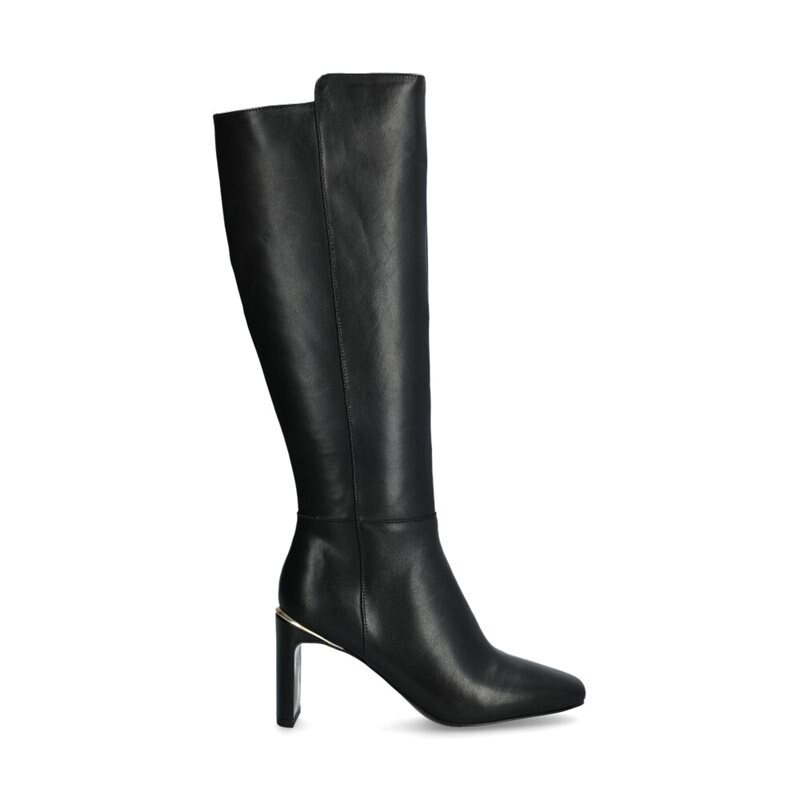 Stövlar från Tamaris i svart skinn. Kort, dold elastik och dragkedja på insidan av skaftet. Rak tå och tunn bred klack med guldfärgad detalj, klackhöjd ca 8,5 cm.