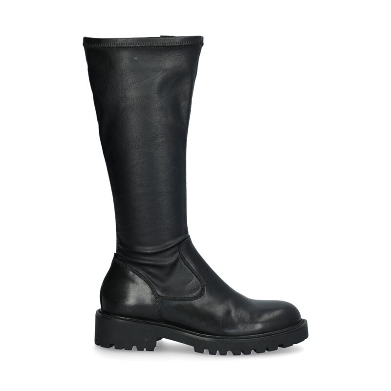 Kenova, stövlar från Vagabond i svart skinn med skaft i stretchmaterial och dragkedja på insidan. Rundad tå och knähögt skaft, klackhöjd ca 4 cm. Yttersula i svart gummiblandning med grovt mönster.