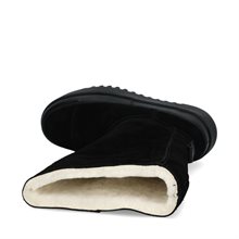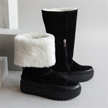 Mount Marty från Canada Snow. Svart stövel med en ovandel i mocka. Stöveln är fodrad i ett härligt vitt fårskinnsfoder och har en fodrad innersula i lana, ull på textil, för extra värmeisolering. Mellansula i värmeisolerande skikt i kork, aluminium och thinsulate. Yttersulan är en lättviktssula i gummiblandning.