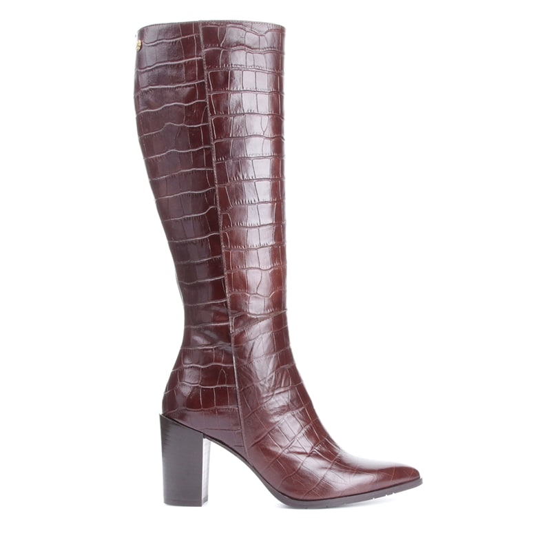Tropea, stövlar från Novita, Perfect Fit W2. Ovandel i fint, brunt skinn med crocomönster. Spetsig tå och en fint designad klack ca 8,5 cm hög. Dragkedja på insidan, yttersula i gummi för bra grepp och flexibilitet. Finns i W2. Novita är tidlösa, unika och omsorgsfullt tillverkade skor av finaste skinn från utvalda garverier.