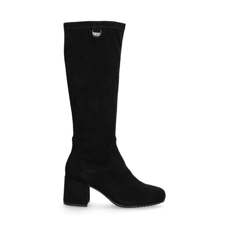 Yew, stövlar från Dasia i svart syntet. Perfect Fit-stövlar med stretchig mockasyntet i skaftet som gör att stöveln sitter snyggt på benet. Mandelformad tå och blockklacken, ca 6,5 cm hög, är även den klädd i mocka. En funktionell dragkedja på insidan av skaftet gör dessa stövlar enkla att ta på och av. Yttersulan i gummi har en räfflad struktur som ger ett bra grepp. Foder och innersula helt i skinn. Dasia är designade skor med feminina influenser, stilrena linjer och hög komfort.