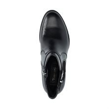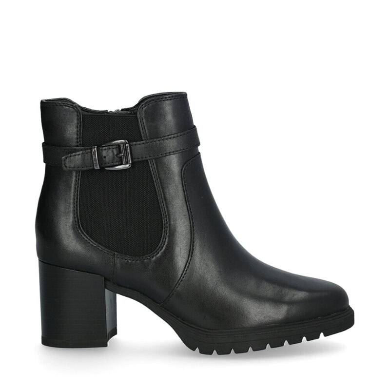 Stilrena chelsea stövletter från Tamaris med praktisk dragkedja på insidan. Ovandel i skinn och textil med dekorativ rem ovanför ankeln. 6,5 cm höga blockklackar i kombination med en lätt rafflad sula i framre delen. Innefoder i textil för komfort.