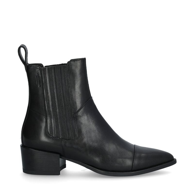 Marja, stövletter från Vagabond i svart skinn med dolda elastikpaneler på sidorna. Spetsig tåform och bred klack ca 5 cm hög. Fodrade med textil och innersulor i skinn, yttersulor i gummi.