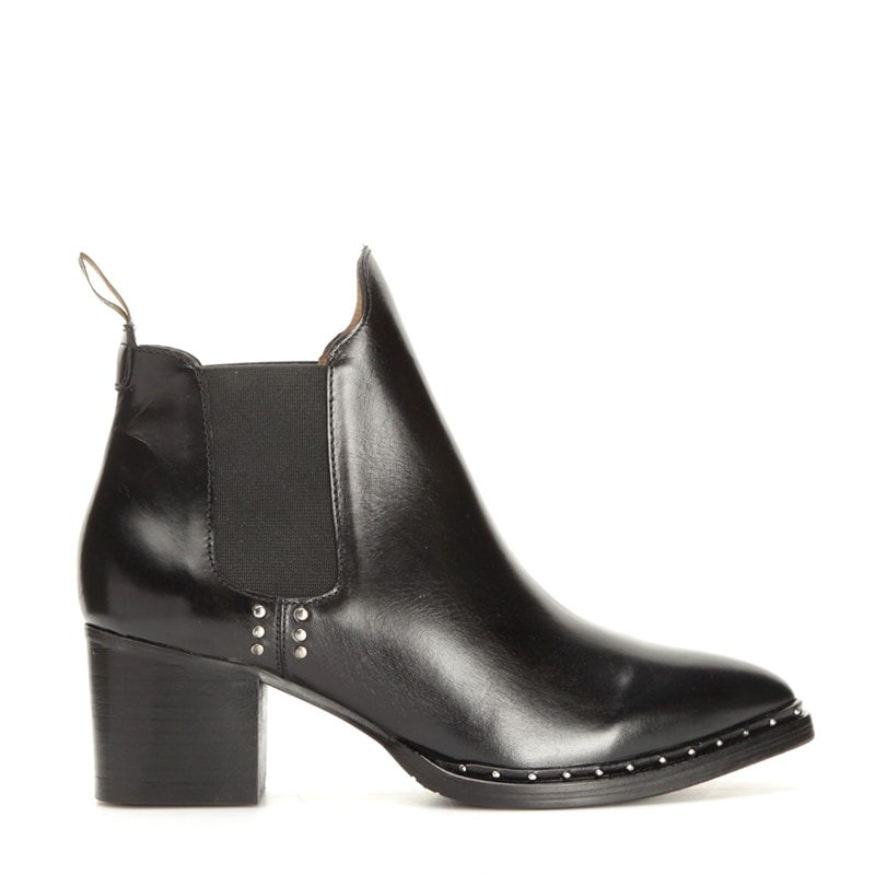 Andria, boots från Novita med i svart skinn med små silverfärgade nitar. Ovandelen har resår på sidorna, spetsig tå och mellanhög klack, ca 6,5 cm. Innerfoder samt innersula i mjukt naturfärgat skinn. Yttersula i tunit och gummi med mellanskikt i flexibelt sviktmaterial. Novita är tidlösa, unika och omsorgsfullt tillverkade skor av finaste skinn från utvalda garverier.