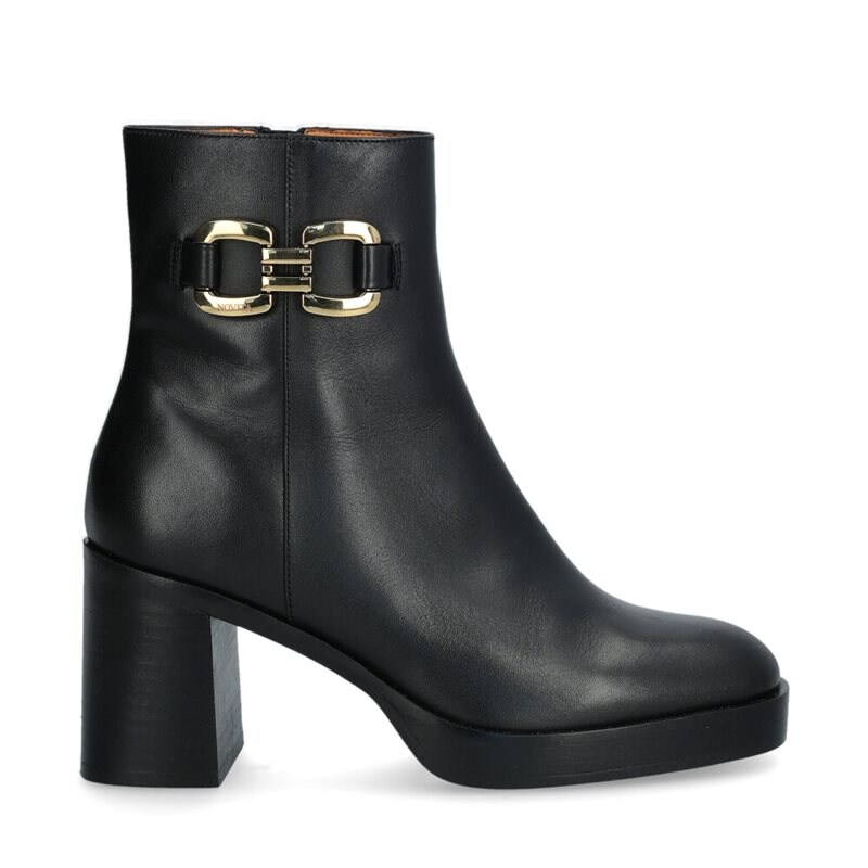 Bolsena, stövletter från Novita, den ultimata kombinationen av stil och komfort. Deras eleganta svarta skinn passar perfekt för alla tillfällen. Det dekorativa guldfärgade spännet på utsidan av skaftet ger en trendig touch. Med en dragkedja på insidan är de lätta att ta på och av. Denna stövletts klack är ungefär 7,5 cm hög och en platåsula fram ger extra stabilitet, vilket gör dem både snygga och bekväma. Skafthöjd ca 14 cm.
