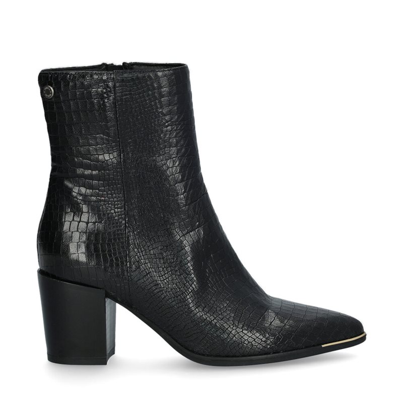 Cefalu, boots i svart crockomönstrat skinn från Novita. Mjuk ovandel av finaste skinn och fodrade med nappaskinn. Guldfärgad metalldekor vid tån och en dekorativ knapp på utsidan av skaftet. Dragkedja på insidan av skaftet, yttersula av gummi.