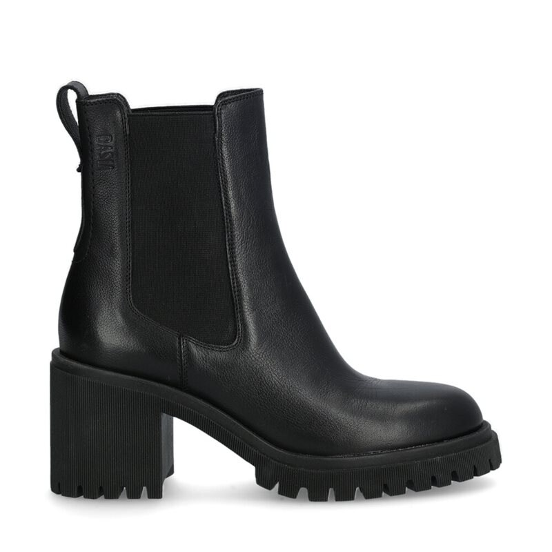 Darcey, stövletter i en snygg chelseamodell från Dasia. Ovandel i svart skinn. Stövletter med klack, ca 8 cm hög, och något tvär tå. Foder i textil med innersula helt i skinn, loop baktill som gör det enkelt att komma i och ur skorna som också blir en snygg detalj. Yttersulan i gummi är otroligt skön och platåsiluetten gör att lutningen på foten blir bekväm även om det är en klack. Grovtandad som också ger ett bra grepp.