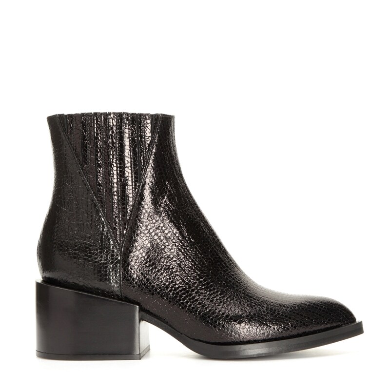 Monica, stövletter från Novita by Viozzi. Ovandel i svart snakemönstrat skinn med blank yta och med dold resår i skaftet. Rak blockklack, och spetsig tå. Novita by Viozzi är handgjorda skor i bästa kvalitet, ett genuint hantverk tillverkade i Italien. Säljs enbart online och i få utvalda butiker.
