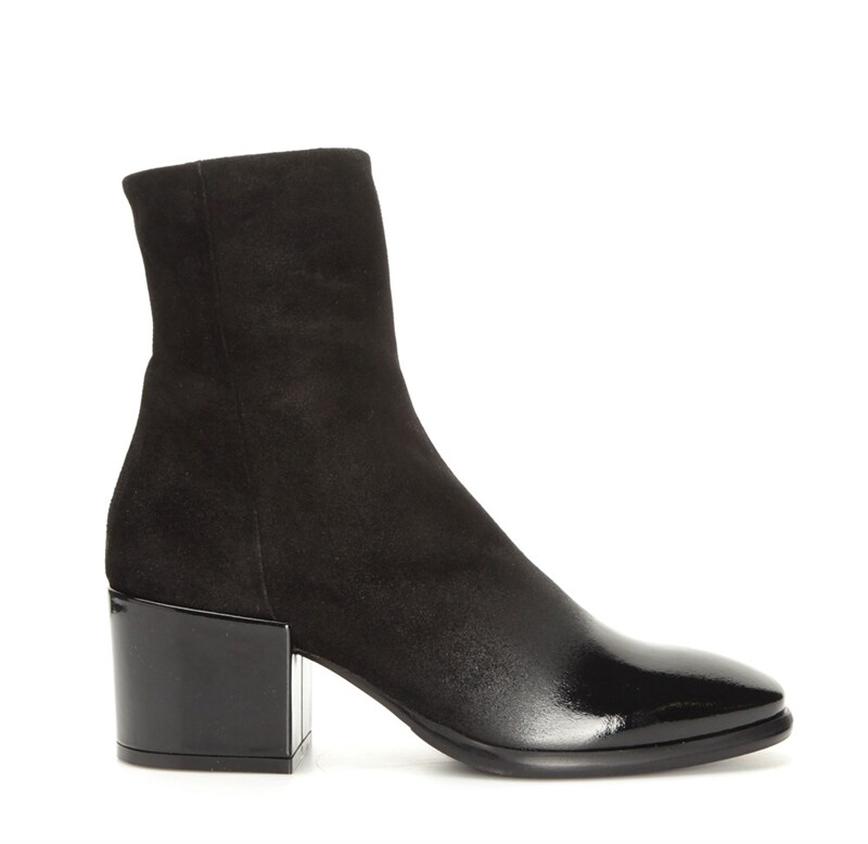 Vanni, stövletter från Novita by Viozzi. Ovandel i svart mocka med lacktå och matchande blanksvart blockklack. Dragkedja på insidan, foder i skinn. Yttersula i svart skinn. Novita by Viozzi är handgjorda skor i bästa kvalitet, ett genuint hantverk tillverkade i Italien. Säljs enbart online och i få utvalda butiker.