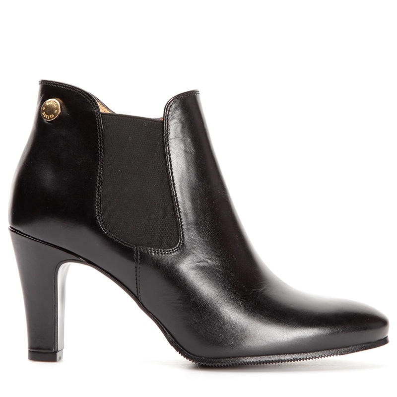 Stövlett i skinn med resår på sidorna. En lagom hög klack gör att den passar både till vardags och fest. Foder i getskinn av bästa kvalitet. Novita är tidlösa, unika och omsorgsfullt tillverkade skor av finaste skinn från utvalda garverier.