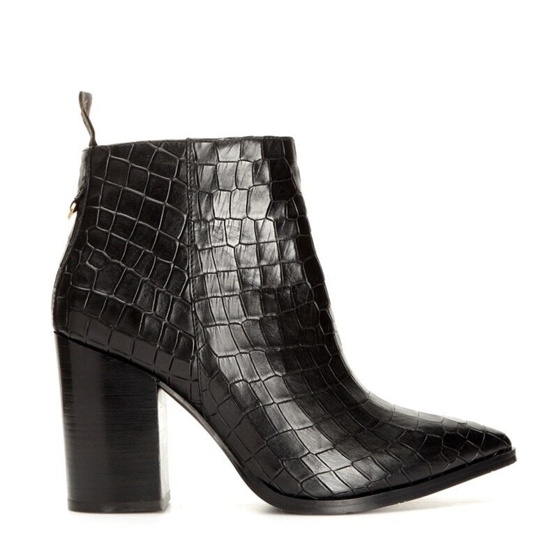 Portici, stövletter från Novita i crocomönstrat svart skinn. Stövletterna har spetsig tå och en blockklack på ca 9 cm. Dragkedja på insidan och inuti är skorna fodrade med skinn. Novita är tidlösa, unika och omsorgsfullt tillverkade skor av finaste skinn från utvalda garverier.