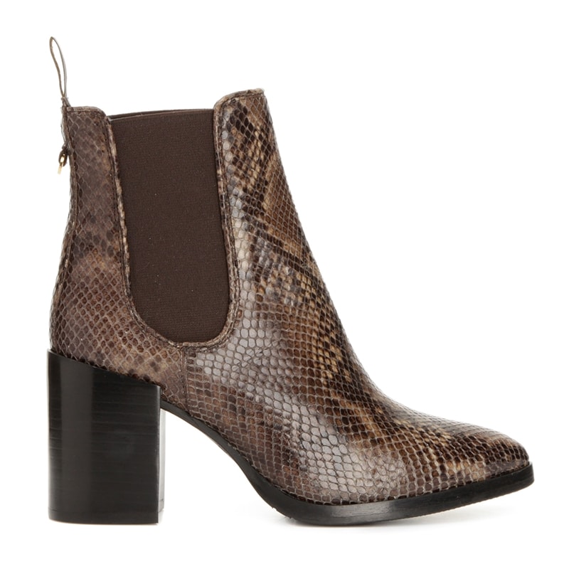 Rom, stövletter från Novita i ormskinnsmönstrat läder med bruna skiftningar. Stövletten har en spetsig tå samt resår på sidorna av skaftet. Inuti så är skon fodrad med skinn, den stablia klacken är ca 8 cm hög. Denna modell är tillverkad i Portugal. Novita är tidlösa, unika och omsorgsfullt tillverkade skor av finaste skinn från utvalda garverier.