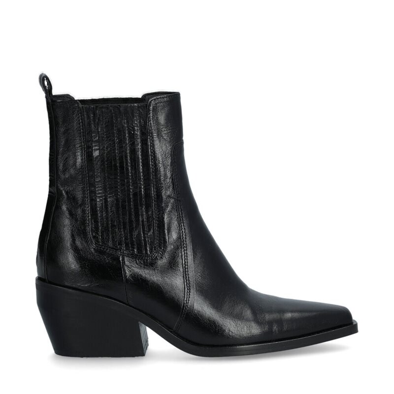 Taranto, boots från Novita med westernstuk. Ovandel i svart skinn med dold resår. Spetsig tåform och något längre läst, lätt lutande klack, ca 6 cm hög. Bootsen är fodrade med skinn och har en skafthöjd på ca 14,5 cm.