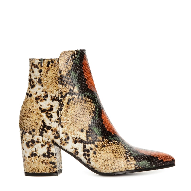 Valeria, stövletter från Novita med reptilmönstrad ovandel i skinn. Spetsig tå, klackhöjd ca 6,5 cm. Dragkedja på insidan av skaftet.