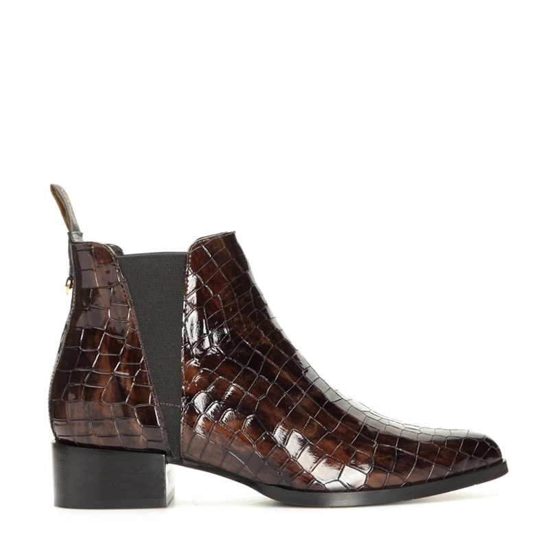 Vanessa, stövletter i chelseamodell från Novita. Ovandel i brunt crocomönstrat skinn med snygga färgskiftningar. Bootsen har en spetsig tå och kilformade resårer på sidorna. Draghälla på bakkappan, insidan fodrad med skinn, yttersula i svart gummi. Novita är tidlösa, unika och omsorgsfullt tillverkade skor av finaste skinn från utvalda garverier.