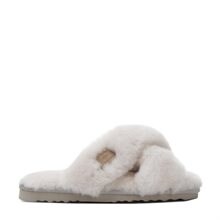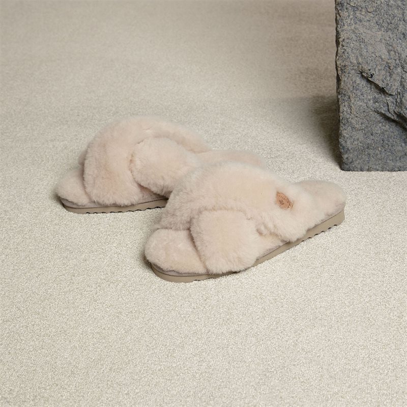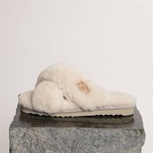 Edmonton, innetofflor från Canada Snow med breda, korsade remmar över foten i ljusbeige fårskinn. Innersula i fårskinn, yttersulan är något kilformad.