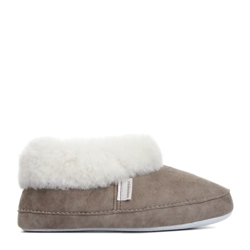Emmy, innetofflor från Shepherd i gråbeige fårskinn med ljus fårskinnskrage. Värmande toffflor med mjuk sula i mocka.