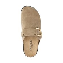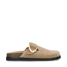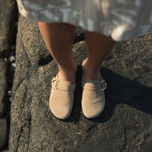 Märtha sandaler från Sweeks - klassiska mules med hög komfort. Ovandelen är tillverkad i beige mocka med dekorativt guldfärgat spänne. Korksulan med uppbyggd fotbädd i textil gör att du enkelt kan gå bekvämt i sandalerna hela dagen utan att få trötta fötter. Räfflad yttersula i TR som ger lättare grepp och stabilitet. Märtha passar lika bra till en avslappnad vardagslook som till stranden.