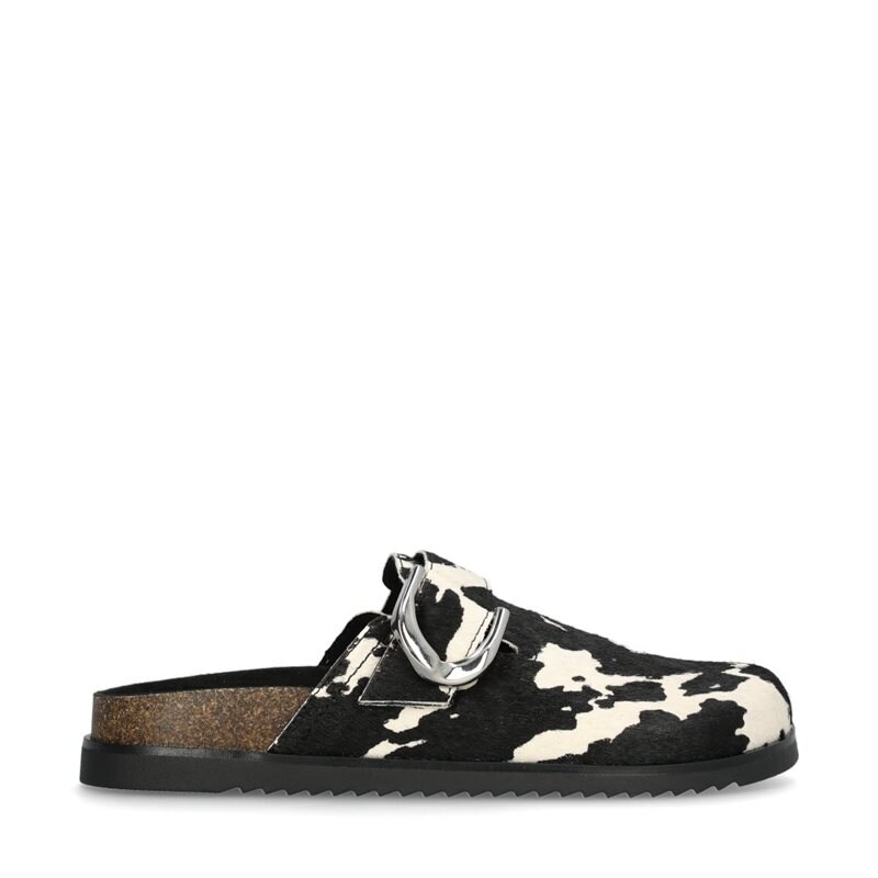 Märtha sandaler från Sweeks - klassiska mules med hög komfort. Mönstrad ovandel i vit och svart kopäls med silverfärgat spänne. Korksulan med uppbyggd fotbädd i textil gör att du enkelt kan gå bekvämt i sandalerna hela dagen utan att få trötta fötter. Räfflad yttersula i TR som ger lättare grepp och stabilitet.